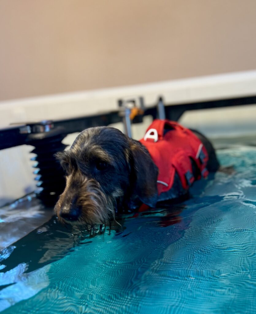 Das bei der Unterwassertherapie verringerte Eigengewicht des Tieres reduziert die Gelenkbelastung erheblich und ermuntert den โPatientenโ zu aktiver Bewegung.